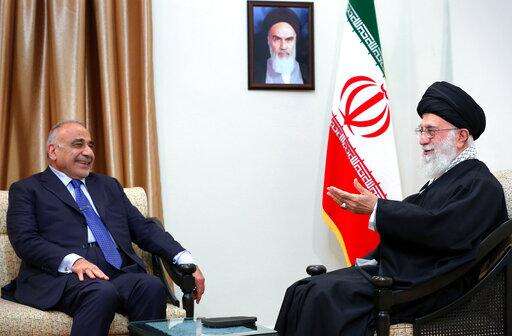 FILE - In this Saturday, April, 6, 2019 file photo, released by an official website of the office of the Iranian supreme leader, Supreme Leader Ayatollah Ali Khamenei, right, speaks with Iraqi Prime Minister Adel Abdel Mahdi, in Tehran, Iran. Iraq is seeking to reclaim a leadership role in the Arab world after decades of conflict. It is focusing on a centrist policy and its top leaders are determined to maintain good relations with both Iran and the United States. (Office of the Iranian Supreme Leader via AP, File) The Associated Press