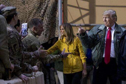 FILE -- In this Dec. 26, 2018 file photo, President Donald Trump and first lady Melania Trump greet members of the military at a hangar rally at Al Asad Air Base, Iraq. Iraq is seeking to reclaim a leadership role in the Arab world after decades of conflict. It is focusing on a centrist policy and its top leaders are determined to maintain good relations with both Iran and the United States. (AP Photo/Andrew Harnik, File) The Associated Press
