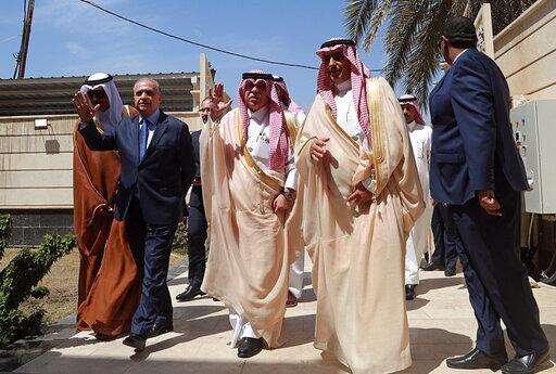 FILE - In this April 4, 2019 file photo, Saudi Minister of Commerce and Investment, Majid bin Abdullah Al Qasabi, center, and Iraq Foreign Minister Mohamed Alhakim, second left, wave as they arrive for the opening ceremony of a Saudi Arabia consulate in Baghdad, Iraq. A flurry of recent diplomatic activity and high-profile visits to the Iraqi capital, points to a new era of openness as the nation sheds its war image. Iraq needs much help and investment to rebuild its cities -- something it can only get from oil- and gas-rich Gulf countries, including Saudi Arabia. (AP Photo/Hadi Mizban, File) The Associated Press
