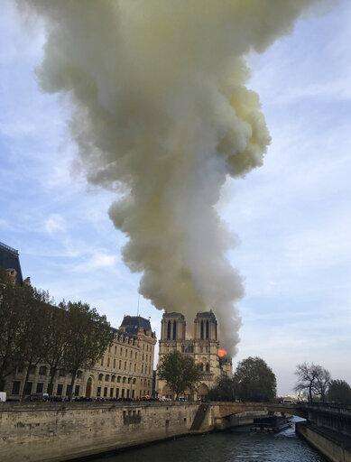 Plumes of smoke rises from Notre Dame cathedral burning in Paris, Monday, April 15, 2019. Massive plumes of smoke fills the air above Notre Dame Cathedral and ash is reported to be falling on tourists and others around the island that marks the center of Paris. (AP Photo)