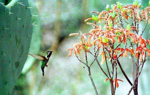 FILE - In this March, 23, 1999 file photo, a Costa's hummingbird searches a flowering Aloe Striata for a drink in Scottsdale, Ariz. In a study released on Monday, April 15, 2019, the bird is included in the “neighbors” category, whose few Google searches were confined to where they live. (N. Scott Trimble/East Valley Tribune via AP) The Associated Press