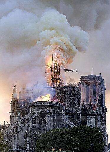 Flames and smoke rise as the spire on Notre Dame cathedral collapses in Paris, Monday, April 15, 2019. Massive plumes of yellow brown smoke is filling the air above Notre Dame Cathedral and ash is falling on tourists and others around the island that marks the center of Paris. (AP Photo/Diana Ayanna) The Associated Press