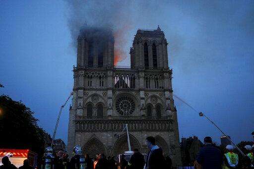 Firefighters tackle the blaze as flames and smoke rise from Notre Dame cathedral as it burns in Paris, Monday, April 15, 2019. Massive plumes of yellow brown smoke is filling the air above Notre Dame Cathedral and ash is falling on tourists and others around the island that marks the center of Paris. (AP Photo/Thibault Camus) The Associated Press