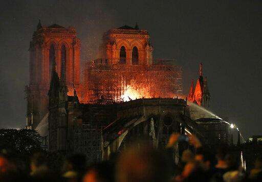 Flames illuminate the night sky as Notre Dame cathedral burns in Paris, Monday, April 15, 2019. Massive plumes of yellow brown smoke is filling the air above Notre Dame Cathedral and ash is falling on tourists and others around the island that marks the center of Paris. (AP Photo/Thibault Camus) The Associated Press