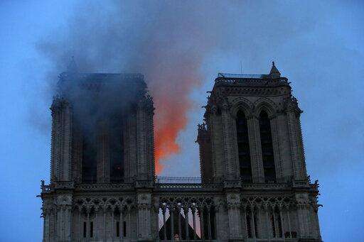 Smoke and flames fill the sky as a fire burns at the Notre Dame Cathedral during the visit by French President Emmanuel Macron in Paris, Monday, April 15, 2019. A catastrophic fire engulfed the upper reaches of Paris' soaring Notre Dame Cathedral as it was undergoing renovations Monday, threatening one of the greatest architectural treasures of the Western world as tourists and Parisians looked on aghast from the streets below.(Philippe Wojazer/Pool via AP) The Associated Press