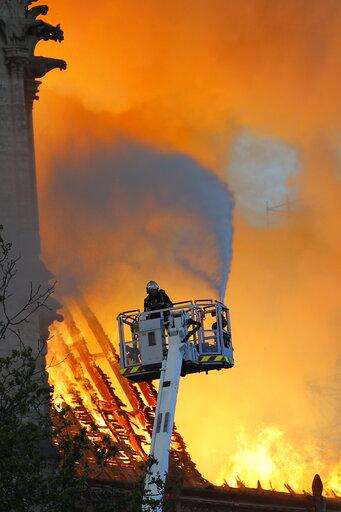A fire fighter uses a hose as Notre Dame cathedral is burning in Paris, Monday, April 15, 2019. A catastrophic fire engulfed the upper reaches of Paris' soaring Notre Dame Cathedral as it was undergoing renovations Monday, threatening one of the greatest architectural treasures of the Western world as tourists and Parisians looked on aghast from the streets below. (AP Photo/Francois Mori) The Associated Press