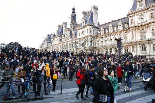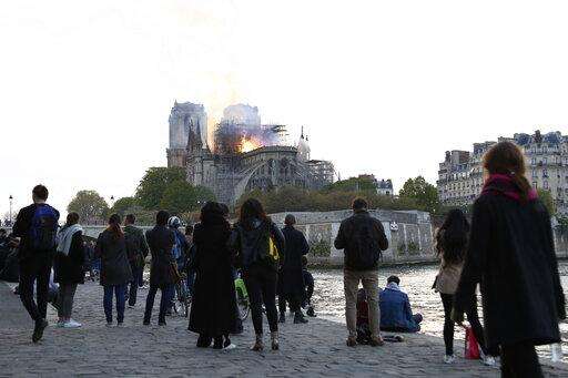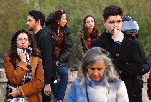 People watch as flames and smoke rise from Notre Dame cathedral as it burns in Paris, Monday, April 15, 2019. Massive plumes of yellow brown smoke is filling the air above Notre Dame Cathedral and ash is falling on tourists and others around the island that marks the center of Paris. (AP Photo/Thibault Camus)