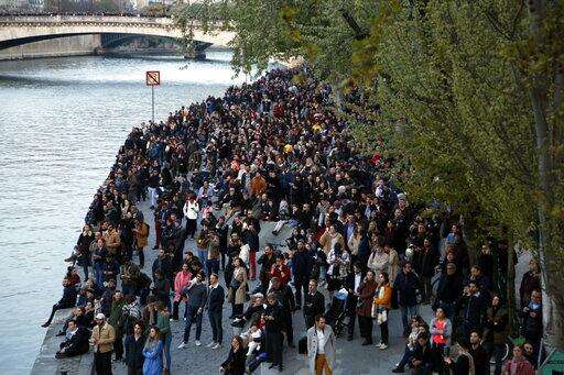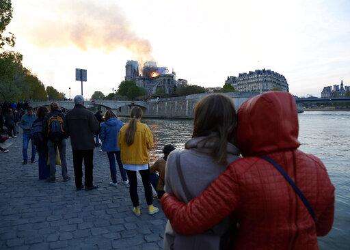 People standing on the banks of the river Seine watch as flames and smoke rise from Notre Dame cathedral as it burns in Paris, Monday, April 15, 2019. Massive plumes of yellow brown smoke is filling the air above Notre Dame Cathedral and ash is falling on tourists and others around the island that marks the center of Paris. (AP Photo/Thibault Camus)