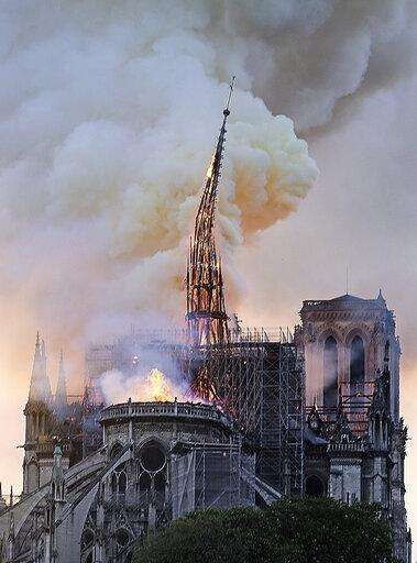 Flames and smoke rise as the spire on Notre Dame cathedral collapses in Paris, Monday, April 15, 2019. Massive plumes of yellow brown smoke is filling the air above Notre Dame Cathedral and ash is falling on tourists and others around the island that marks the center of Paris. (AP Photo/Diana Ayanna)