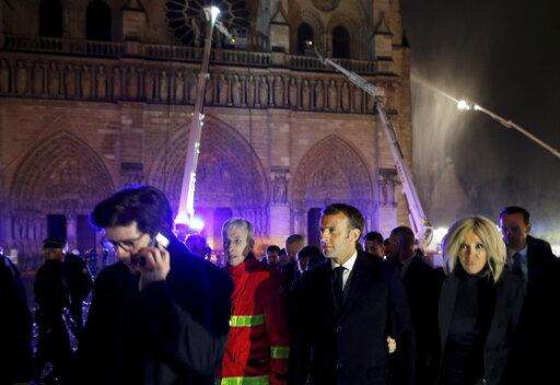 French President Emmanuel Macron, center, and his wife Brigitte walk away from Notre Dame cathedral in Paris, Monday, April 15, 2019. A catastrophic fire engulfed the upper reaches of Paris' soaring Notre Dame Cathedral as it was undergoing renovations Monday, threatening one of the greatest architectural treasures of the Western world as tourists and Parisians looked on aghast from the streets below.(Philippe Wojazer/Pool via AP)