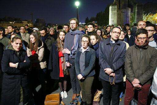 People pray as Notre Dame cathedral is burning in Paris, Monday, April 15, 2019. A catastrophic fire engulfed the upper reaches of Paris' soaring Notre Dame Cathedral as it was undergoing renovations Monday, threatening one of the greatest architectural treasures of the Western world as tourists and Parisians looked on aghast from the streets below. (AP Photo/Christophe Ena)
