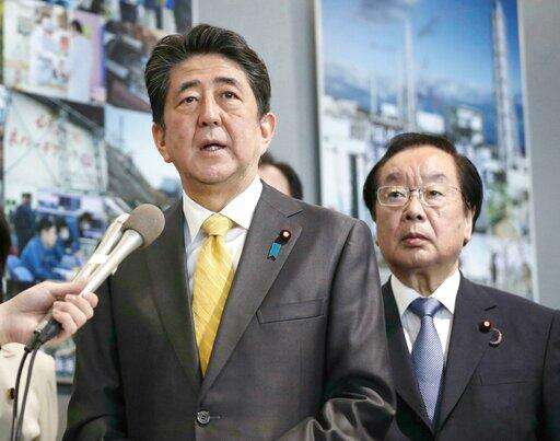 Japanese Prime Minister Shinzo Abe speaks to the media after Abe visited Fukushima Dai-ichi nuclear power plant in Okuma, Fukushima prefecture, Japan, Sunday, April 14, 2019. Prime Minister Abe inspected the reconstruction effort following the tsunami, quake and nuclear accident in 2011. (Kyodo News via AP) The Associated Press