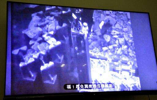 The screen shows that the first of 566 used and unused fuel units stored in the pool at Unit 3 are being removed, at Fukushima Dai-ichi nuclear plant, in Okuma, Fukushima Prefecture, northeastern Japan Monday. April 15, 2019. The operator of the tsunami-wrecked nuclear plant has begun removing fuel from a cooling pool at one of three reactors that melted down in the 2011 disaster, a milestone in the decades-long process to decommission the plant. (Kyodo News via AP) The Associated Press