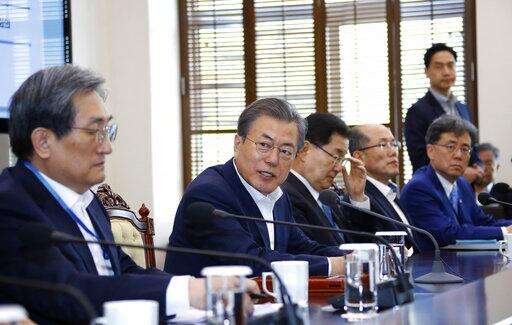 South Korean President Moon Jae-in, second from left, speaks during a meeting with his aids at the presidential Blue House in Seoul, South Korea, Monday, April 15, 2019. Moon says he's ready for a fourth summit with North Korean leader Kim Jong Un to help salvage faltering nuclear negotiations between Washington and Pyongyang. (Bee Jae-man/Yonhap via AP) The Associated Press