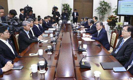 South Korean President Moon Jae-in, second from right, speaks during a meeting with his aids at the presidential Blue House in Seoul, South Korea, Monday, April 15, 2019. Moon says he's ready for a fourth summit with North Korean leader Kim Jong Un to help salvage faltering nuclear negotiations between Washington and Pyongyang. (Chun Shin/Newsis via AP) The Associated Press