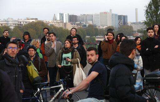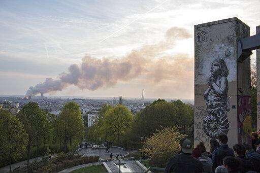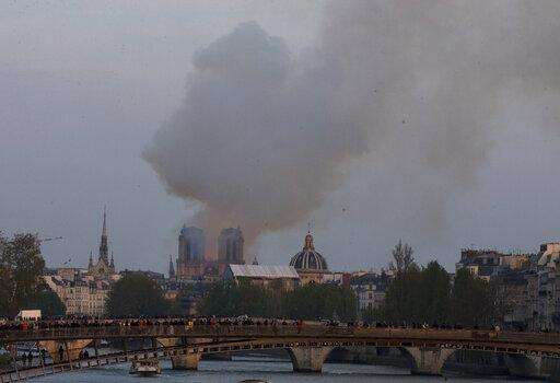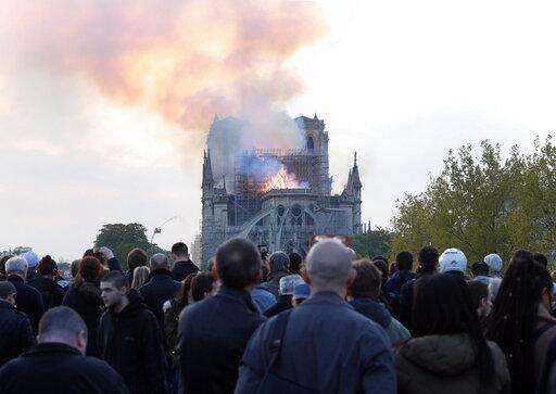 People watch as flames and smoke rise from Notre Dame cathedral as it burns in Paris, Monday, April 15, 2019. Massive plumes of yellow brown smoke is filling the air above Notre Dame Cathedral and ash is falling on tourists and others around the island that marks the center of Paris. (AP Photo/Thibault Camus) The Associated Press