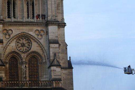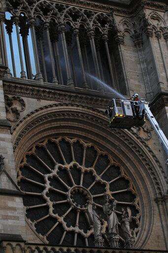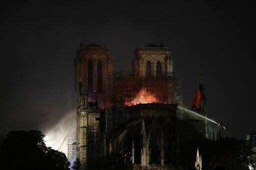 A firefighter uses a hose as Notre Dame cathedral burns in Paris, Monday, April 15, 2019. A catastrophic fire engulfed the upper reaches of Paris' soaring Notre Dame Cathedral as it was undergoing renovations Monday, threatening one of the greatest architectural treasures of the Western world as tourists and Parisians looked on aghast from the streets below. (AP Photo/Francois Mori) The Associated Press
