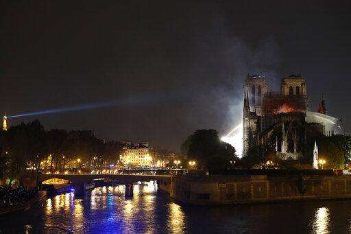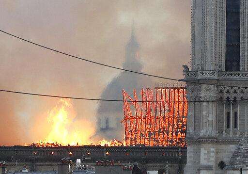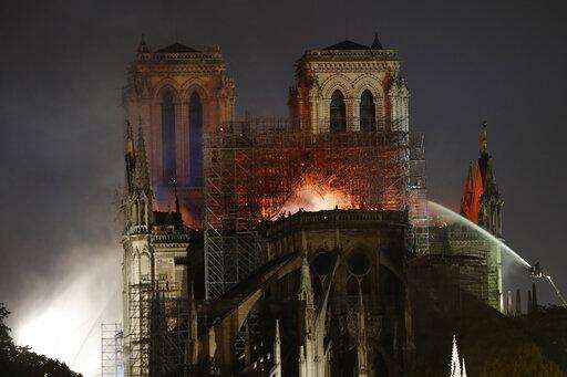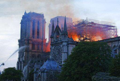 Notre Dame cathedral is burning in Paris, Monday, April 15, 2019. A catastrophic fire engulfed the upper reaches of Paris' soaring Notre Dame Cathedral as it was undergoing renovations Monday, threatening one of the greatest architectural treasures of the Western world as tourists and Parisians looked on aghast from the streets below. (AP Photo/Christophe Ena) The Associated Press