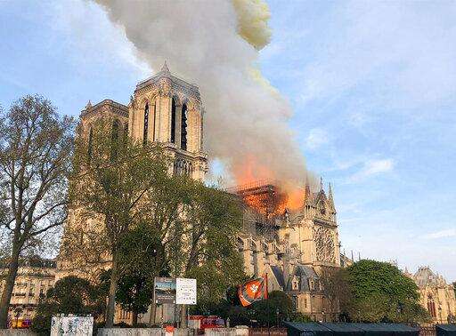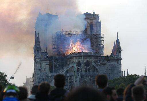 Flames and smoke rise from Notre Dame cathedral as it burns in Paris, Monday, April 15, 2019. Massive plumes of yellow brown smoke is filling the air above Notre Dame Cathedral and ash is falling on tourists and others around the island that marks the center of Paris. (AP Photo/Thibault Camus) The Associated Press