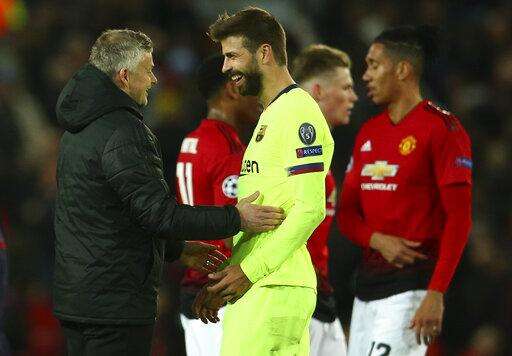 Manchester United coach Ole Gunnar Solskjaer, left, talks with Barcelona's Gerard Pique at the end of the Champions League quarterfinal, first leg, soccer match between Manchester United and FC Barcelona at Old Trafford stadium in Manchester, England, Wednesday, April 10, 2019. (AP Photo/Dave Thompson) The Associated Press