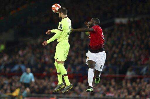 Barcelona's Gerard Pique, left, and Manchester United's Romelu Lukaku jump for the ball during the Champions League quarterfinal, first leg, soccer match between Manchester United and FC Barcelona at Old Trafford stadium in Manchester, England, Wednesday, April 10, 2019. (AP Photo/Jon Super) The Associated Press