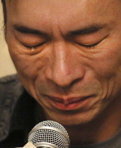 Hong Kong singer Andy Hui attends a press conference about his affair in Hong Kong, Tuesday, April 16, 2019. Hong Kong's Apple Daily newspaper published video that purported to show Andy Hui being intimate in a taxi with another Hong actress, decades younger than him, Jacqueline Wong. (AP Photo/Vincent Yu) The Associated Press