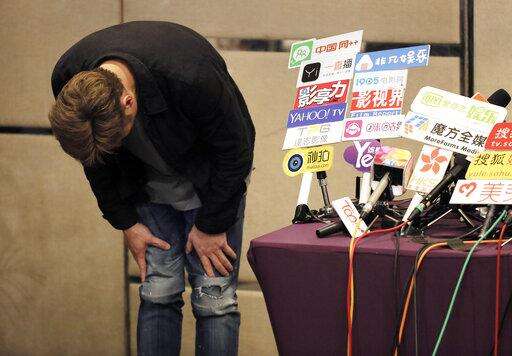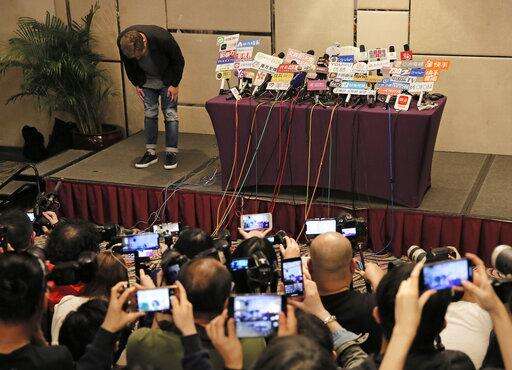 Hong Kong singer Andy Hui bows before a press conference about his affair in Hong Kong, Tuesday, April 16, 2019. Hong Kong's Apple Daily newspaper published video that purported to show Andy Hui being intimate in a taxi with another Hong actress, decades younger than him, Jacqueline Wong. (AP Photo/Vincent Yu) The Associated Press