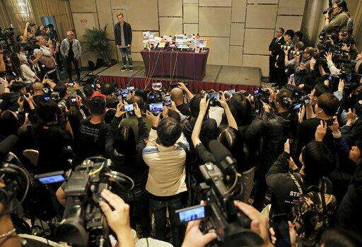 Hong Kong singer Andy Hui stands and let photographers take pictures before a press conference about his affair in Hong Kong, Tuesday, April 16, 2019. Hong Kong's Apple Daily newspaper published video that purported to show Andy Hui being intimate in a taxi with another Hong actress, decades younger than him, Jacqueline Wong. (AP Photo/Vincent Yu) The Associated Press