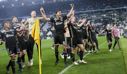 Ajax players celebrate at the end of the Champions League, quarterfinal, second leg soccer match between Juventus and Ajax, at the Allianz stadium in Turin, Italy, Tuesday, April 16, 2019. Ajax won 2-1 and advances to the semifinal on a 3-2 aggregate. (AP Photo/Luca Bruno) The Associated Press