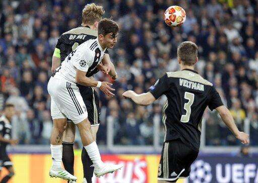 From left, Ajax's Matthijs de Ligt, Juventus' Paulo Dybala and Ajax's Joel Veltman go foe the ball during the Champions League, quarterfinal, second leg soccer match between Juventus and Ajax, at the Allianz stadium in Turin, Italy, Tuesday, April 16, 2019. (AP Photo/Luca Bruno) The Associated Press
