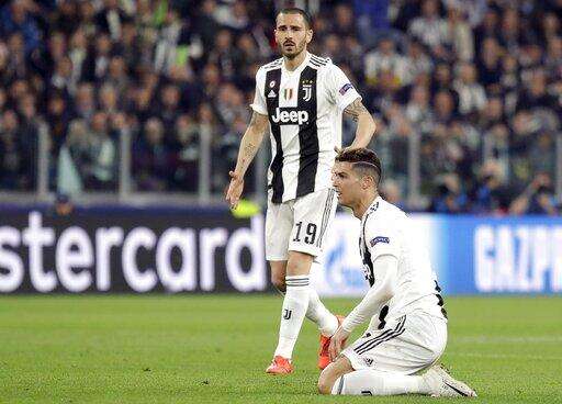Juventus' Cristiano Ronaldo and Leonardo Bonucci, left, react during the Champions League, quarterfinal, second leg soccer match between Juventus and Ajax, at the Allianz stadium in Turin, Italy, Tuesday, April 16, 2019. (AP Photo/Luca Bruno) The Associated Press