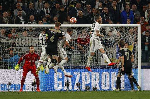 Ajax's Matthijs de Ligt, fourth from right, scores his side's second goal during the Champions League quarter final, second leg soccer match between Juventus and Ajax, at the Allianz stadium in Turin, Italy, Tuesday, April 16, 2019. (AP Photo/Antonio Calanni) The Associated Press