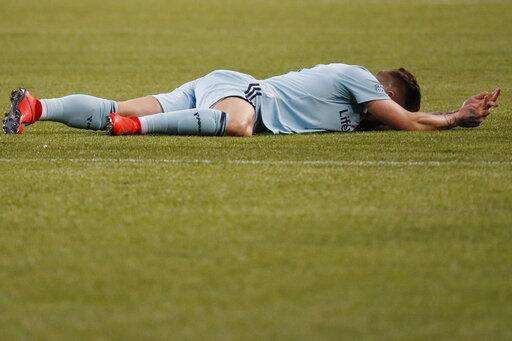 Real Salt Lake midfielder Albert Rusnak lies on the pitch after sustaining a hand injury during the first half of the team's MLS soccer match against FC Cincinnati, Friday, April 19, 2019, in Cincinnati. (AP Photo/John Minchillo)