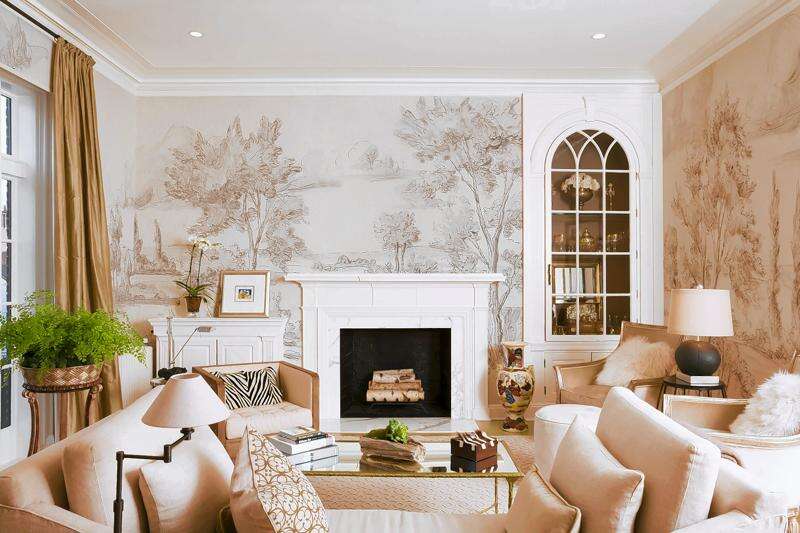 For a home in McLean, Virginia, Cavin-Winfrey covered the dining room walls with a luxurious, one-of-a-kind design from Gracie Studio. The homeowners are avid bird-watchers, and the gilded paper reflects a variety of flora and fauna that are indigenous to the region. For another project, she canvassed the walls of a sitting room, literally, with murals from Harter depicting bucolic rolling hills in the English countryside.