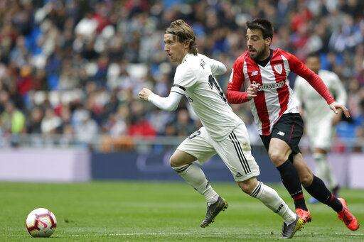 Real Madrid's Luka Modric, left, duels for the ball with Athletic Bilbao's Benat Etxebarria during a Spanish La Liga soccer match between Real Madrid and Athletic Bilbao at the Santiago Bernabeu stadium in Madrid, Spain, Sunday, April 21, 2019. (AP Photo/Bernat Armangue) The Associated Press