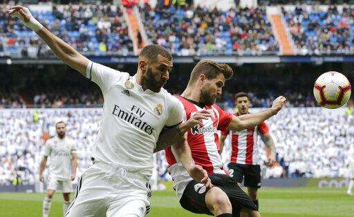 Real Madrid's Karim Benzema, left, vies for the ball with Athletic Bilbao's Inigo Martinez during a Spanish La Liga soccer match between Real Madrid and Athletic Bilbao at the Santiago Bernabeu stadium in Madrid, Spain, Sunday, April 21, 2019. (AP Photo/Bernat Armangue) The Associated Press