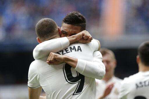 Real Madrid's Karim Benzema, left, is congratulated by his teammate after scoring during a Spanish La Liga soccer match between Real Madrid and Athletic Bilbao at the Santiago Bernabeu stadium in Madrid, Spain, Sunday, April 21, 2019. (AP Photo/Bernat Armangue) The Associated Press