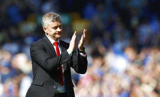 Manchester United manager Ole Gunnar Solskjaer applauds after the final whistle in the English Premier League soccer match against Everton at Goodison Park, Liverpool, England, Sunday April 21, 2019. (Martin Rickett/PA via AP) The Associated Press