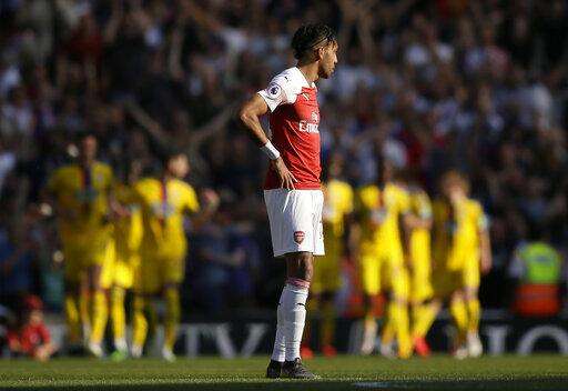Arsenal's Pierre-Emerick Aubameyang looks on as Crystal Palace players celebrate after Wilfried Zaha scoried his side's second goal during the English Premier League soccer match between Arsenal and Crystal Palace at the Emirates Stadium in London, Sunday, April 21, 2019. (AP Photo/Tim Ireland) The Associated Press