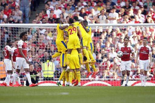 Crystal Palace's players celebrate after James McArthur scored his side's third goal during the English Premier League soccer match between Arsenal and Crystal Palace at the Emirates Stadium in London, Sunday, April 21, 2019. (AP Photo/Tim Ireland) The Associated Press