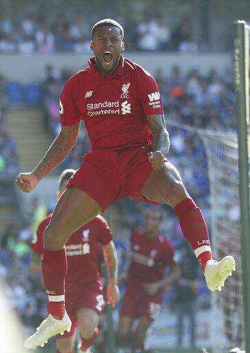 Liverpool's Georginio Wijnaldum celebrates scoring against Cardiff City during the English Premier League soccer match at The Cardiff City Stadium, Cardiff, Wales, Sunday April 21, 2019. (David Davies/PA via AP) The Associated Press