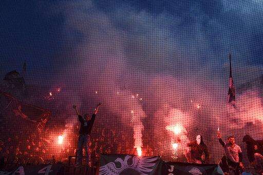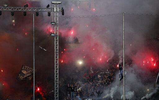 PAOK fans cheer on their team during a Greek Super League soccer match against Levadiakos in Thessaloniki, northern Greece, on Sunday, April 21, 2019. (AP Photo/Giannis Papanikos) The Associated Press