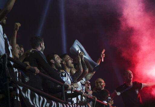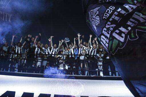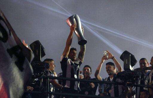 PAOK players raise a trophy as they celebrate their Greek Super League championship title in Thessaloniki, northern Greece, on Sunday, April 21, 2019. PAOK won the Greek league with a round to spare after beating Levadiakos 5-0, 34 years after the last time the team won the championship. (AP Photo/Giannis Papanikos) The Associated Press