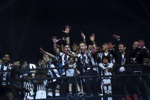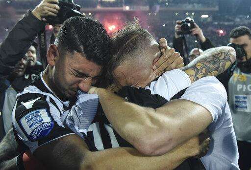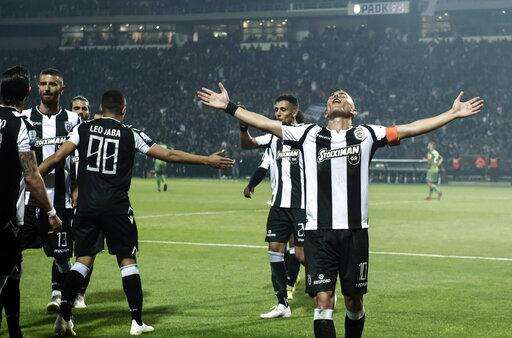 PAOK players celebrate after their Greek Super League soccer match against Levadiakos in Thessaloniki, northern Greece, on Sunday, April 21, 2019. PAOK won the Greek league with a round to spare after beating Levadiakos 5-0, 34 years after the last time the team won the championship. (AP Photo/Giannis Papanikos) The Associated Press