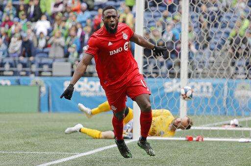 Toronto FC forward Jozy Altidore celebrates after he scored a goal against Seattle Sounders goalkeeper Stefan Frei, right, during the first half of an MLS soccer match, Saturday, April 13, 2019, in Seattle. (AP Photo/Ted S. Warren) The Associated Press