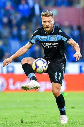 Lazio's Ciro Immobile controls the ball during a Series A soccer match between Sampdoria and Lazio, at the Luigi Ferraris Stadium in Genoa, Italy, Sunday, Thursday, April 28, 2019. (Simone Arveda/ANSA via AP) The Associated Press