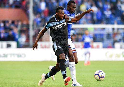 Lazio's Felipe Caicedo, left, and Sampdoria's Omar Colley fight for the ball during a Serie A soccer match between Sampdoria and Lazio, at the Luigi Ferraris Stadium in Genoa, Italy, Sunday, Thursday, April 28, 2019. (Simone Arveda/ANSA via AP) The Associated Press