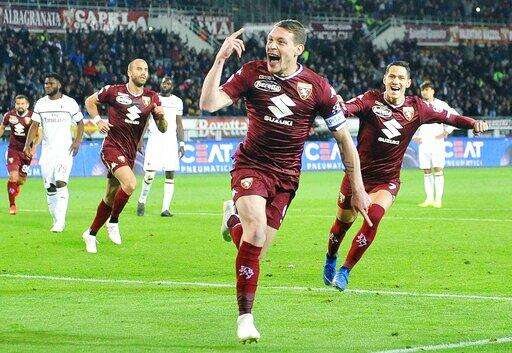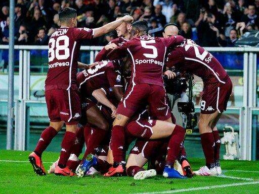 Torino's Andrea Belotti celebrates with teammates after scoring during the Italian Serie A soccer match between Torino FC and AC Milan at the Olimpico Stadium in Turin, Italy, Sunday, April 28, 2019. (Alessandro Di Marco/ansa via AP) The Associated Press