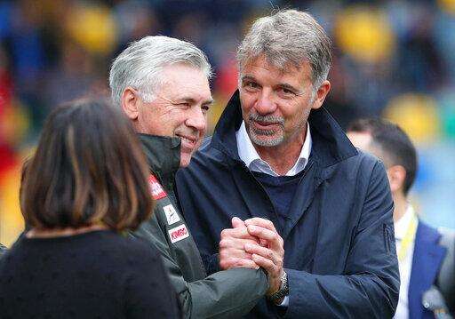 Frosinone coach Marco Baroni, right, shakes hand with Napoli coach Carlo Ancelotti prior to the Serie A soccer match between Frosinone and Napoli, at the Benito Stirpe stadium in Frosinone, Italy, Sunday, April 28, 2019. (Federico Proietti/ANSA via AP) The Associated Press