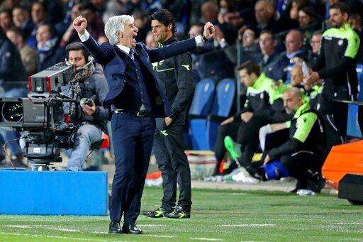 Atalanta coach Gian Piero Gasperini celebrates during the Serie A soccer match between Atalanta and Udinese at the Atleti Azzurri d'Italia stadium in Bergamo, Italy, Monday, April 29, 2019. (Paolo Magni /ANSA via AP)